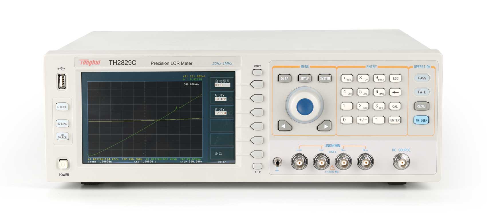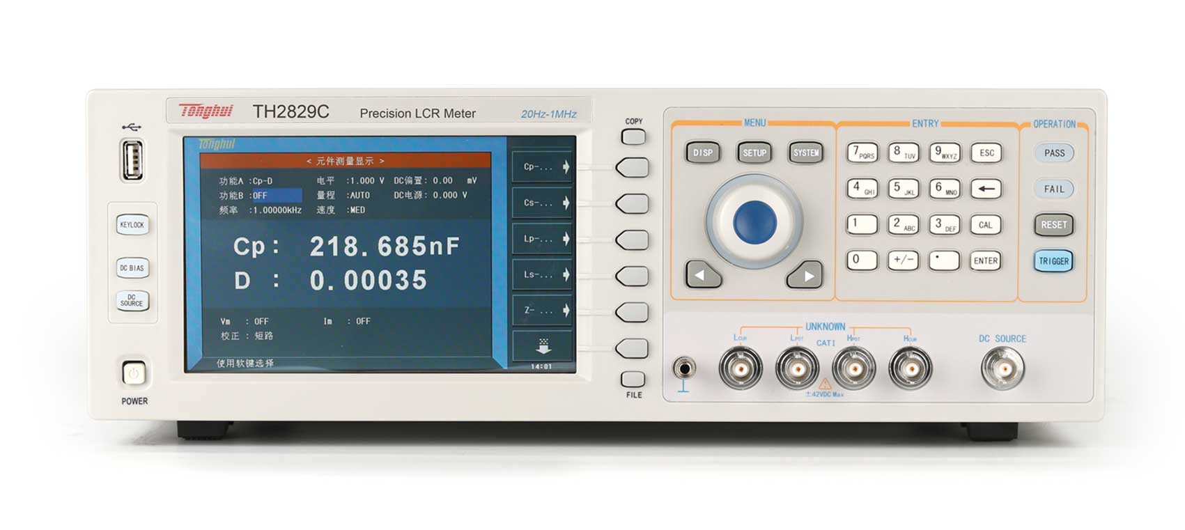 ■?同惠憑借較強的阻抗測試技術和豐富的研發經驗,不斷推出新的阻抗測試產品---TH2829系列自動元件分析儀是我公司最新推出的又一力作。TH2829系列自動元件分析儀應用高速處理器和新的軟件系統,使其擁有更高的測試速度、更全面的分析功能和友好的人機交互體驗。精心設計的測量電路和優化的算法,進一步提升了低D值電容和高Q值電感的測試穩定性。儀器提供的10V交流測試電平、10V/100mA偏置電源和獨立的10V/50mA DC電源,使本儀器可更方便地應用于各種無源/有源器件的測試。雙主副參數顯示、增強的顯示系統設計、多達150點的列表掃描、多種參數的圖形分析能力,使儀器能滿足用戶最多的應用需求。得益于新一代處理器的應用,使儀器具有了更強大的數據處理能力,可將測試結果方便地存儲于U盤或通過多種接口上傳至上位PC或網絡,推進測試自動化,提高測試效率。本機測試頻率為:20Hz-1MHz。具有0.05%的測試準確度、9ms/次的最高測試速度。儀器配有HANDLER、USB、LAN、RS232C 、DCI、GPIB(選配)等豐富的接口,無不彰顯豐富的資源,將帶給客戶較好的性價比體驗。TH2829系列元件分析儀可完全適用于各種工業和軍用標準的測試要求。