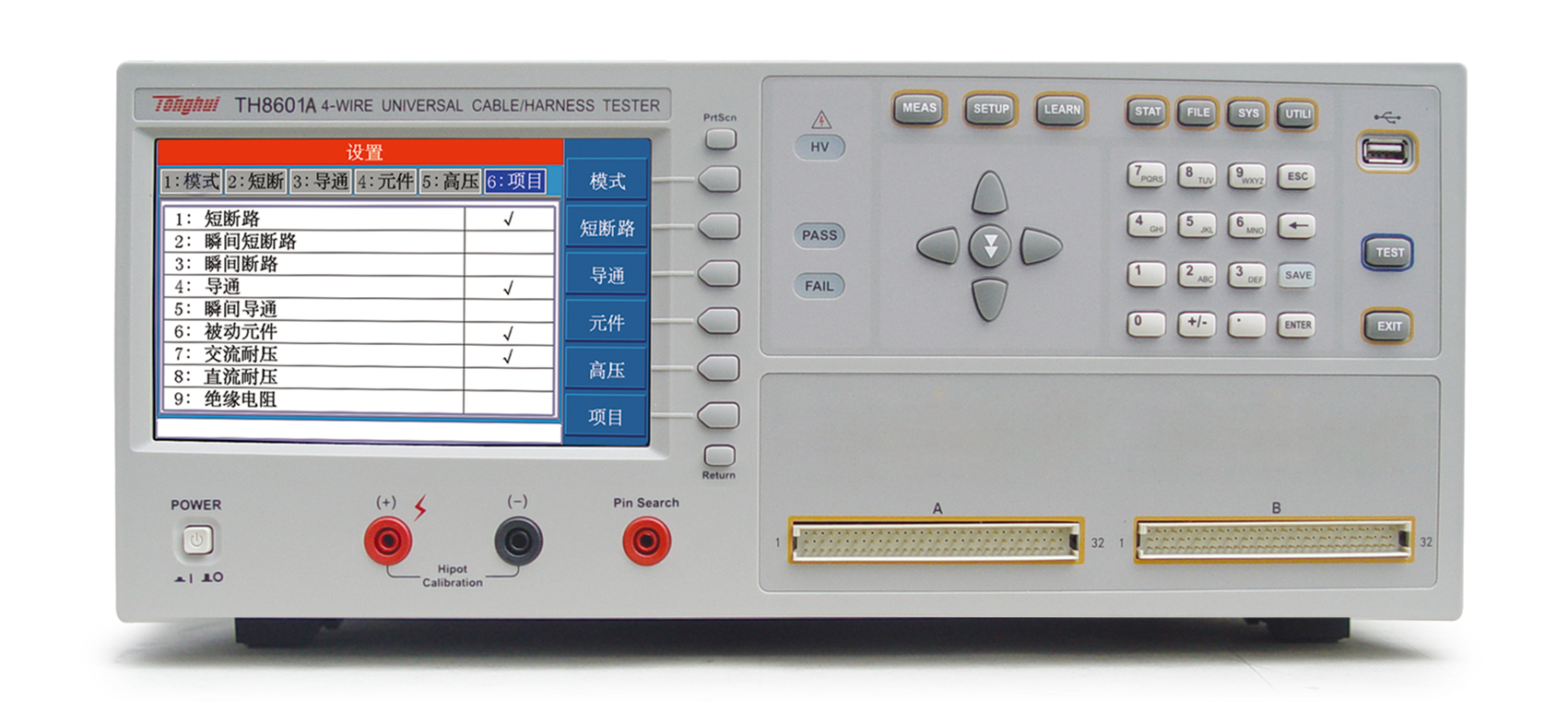 ■?TH8601系列四端線材綜合測試儀是專用于各種線纜,線束和排 線品質及連接可靠性檢驗的多功能,自動化的線材綜合參數測試 系統。該系統提供可編程的恒流恒壓源以及高壓源,測試項目涵蓋了導通,被動元件(電感,電阻,電容,二極管),交直流耐壓,絕緣電阻各種高低壓參數。本系統采用先進的LCR數字采樣及高速長壽命通道切換技術,大大提高了測試精度,速度以及使用壽命。采用高低壓分離技術,大大的提高絕緣電阻的測試性能。豐富的接口設計,本儀器還提供RS232, RS485, GPIB, USB, LAN, Handler等接口,便于用戶運用于自動化檢測和自動化產線。