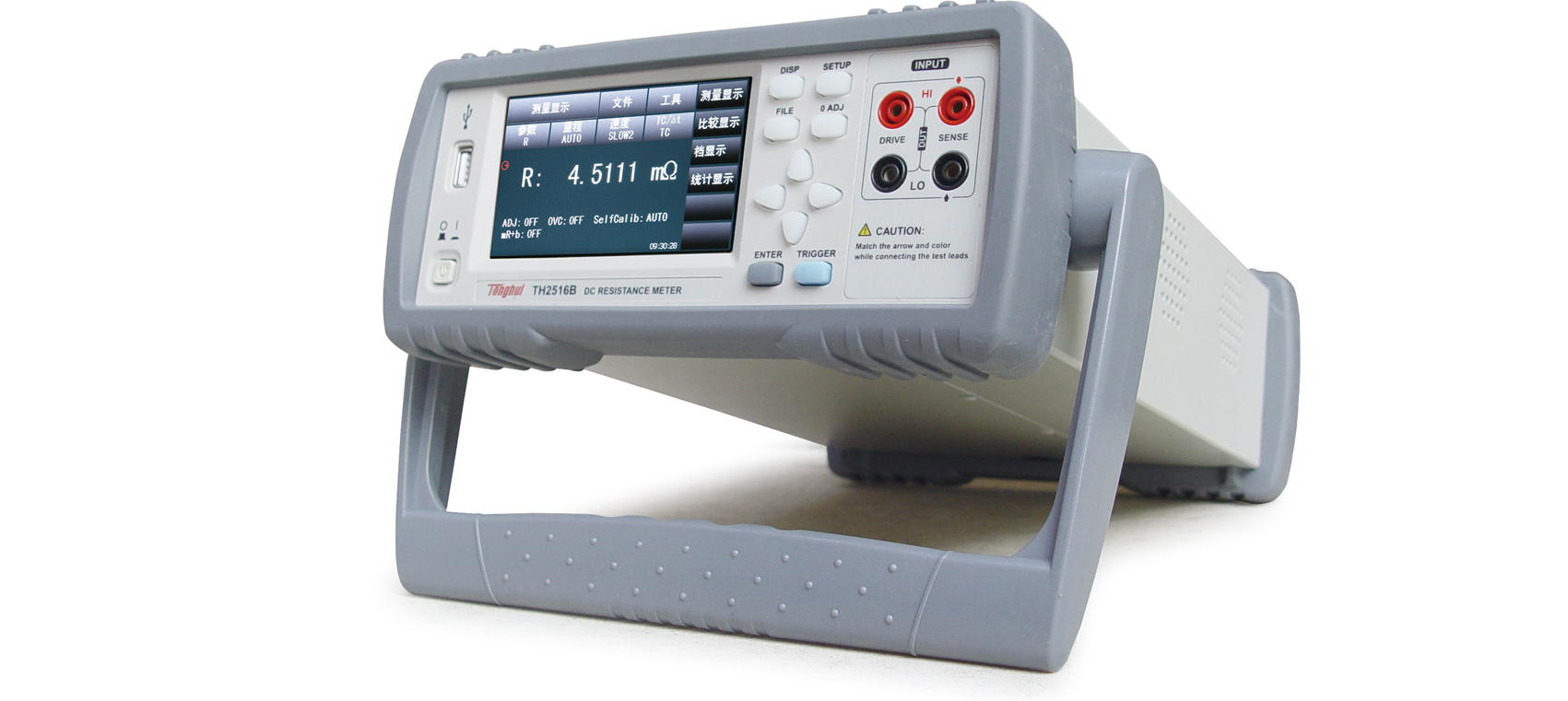 TH2516B 直流電阻測試儀簡介■ TH2516B直流電阻測試儀采用當前主流的32bits CPU和高密度SMD貼裝工藝,帶觸摸功能的24位色4.3英寸彩色液晶屏,界面清爽、操作便捷;0.1%的最高電阻測量精度及1uΩ最小電阻分辨率,其適用于繼電器接觸電阻、接插件接插電阻、導線電阻、印制板線路及焊孔電阻等;其超高速的測試速度以及通過handler接口可以輸出3檔不同邊界的比較結果信號,便于生產線
