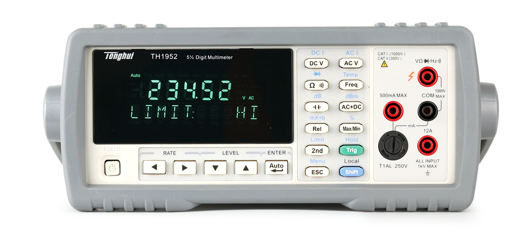 TH1952 五位半數字多用表簡介■ TH1952型5 1/2 位真有效值數字多用表是一種多功能、物美價廉的電壓/電流/電阻/電容測試儀。儀器提供120000字的最大讀數,200次/秒最大ADC采樣速度,0.02%的直流電壓準確度等一系列優良的性能和經濟的價格為廣大客戶提供最優的選擇。TH1952提供高亮度VFD雙參數顯示器,可以同時測量/顯示交流/直流電壓或者電流、交流電壓/電流和頻率等參數,不