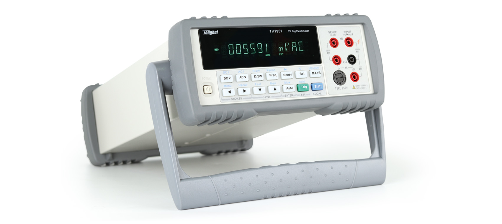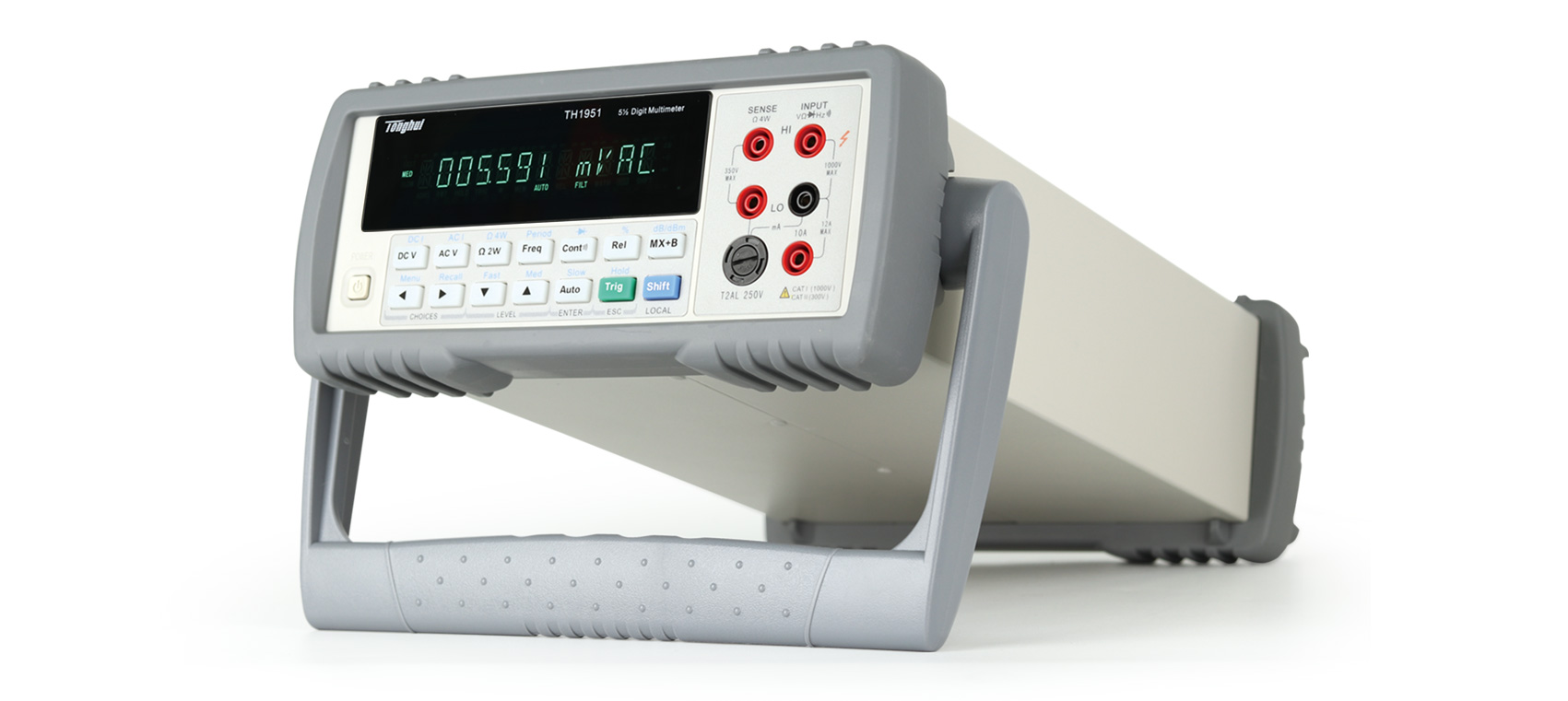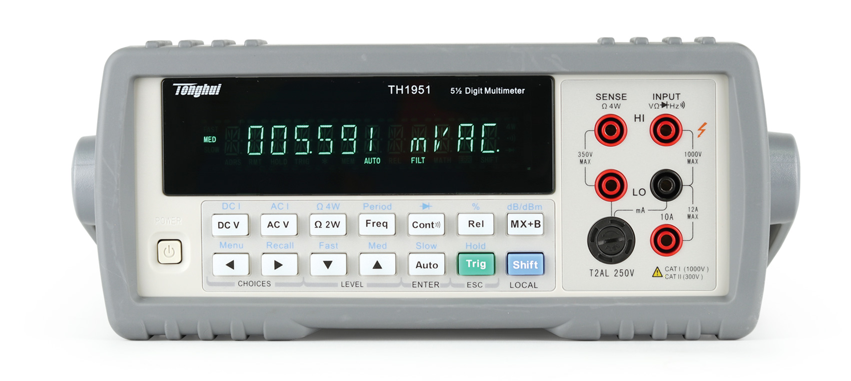 ■ TH1951型5 1/2位數字多用表是一種快速、精確的電壓/電流/電阻測試儀器,儀器提供1,200,000字最大讀數,1000次/秒的最快讀數速率,0.0035%的直流電壓準確度等一系列優良的性能和經濟的價格為廣大客戶提供最優的選擇。TH1951簡潔的前面板設計使您能快捷地得到所需測量功能,大字符高亮度VFD顯示器使測試觀察一目了然。儀器具備12種測量功能,包括直流電壓/ 電流、交流電壓/ 電流、2 線/4 線電阻、頻率/ 周期、導通、二極管測量、dB/dBm功能,涵蓋了基本的電量測試需求。本儀器采用多項新技術,如高速低噪聲的26位A/D轉換技術,使該表具備很好的線性度和低噪聲特性,快速伺服響應放大器、浮動電源及低漂移緩沖放大器構成伺服前端,達到消除傳統衰減、減小零點漂移、提高測量速度的目的。機內采用SMD器件以減小整機密度,降低體積。本儀器采用專門的輸入過載保護電路,使輸入端到地可承受1500伏的高壓,且一旦過載后可快速恢復,從而保證儀器的安全性及可靠性。TH1951配備標準的USB RS232C和GPIB接口,同時可提供通用的通訊軟件以滿足您與計算機通訊、數據分析、統計,構建自動測試系統的需要。儀器接受SCPI(可編程儀器的標準命令)命令,以保證通訊軟件的兼容性。