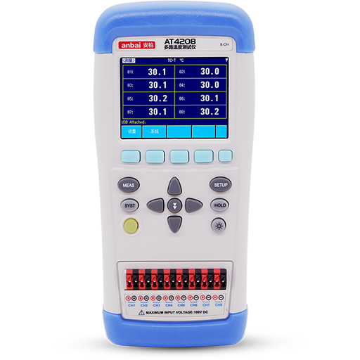 • AT4208手持式多路溫度測試儀采用高性能32位ARM微處理器控制,可同時對8路溫度數據進行采集,上超下超報警和通訊傳輸,兼容K/N/E/J/T/R/S/B型熱電偶,響應速度快,數據穩定,同時具備斷偶檢測功能。超低功耗設計和高密度SMD裝配工藝,真彩TFT液晶顯示屏,并具有鍵盤,觸摸屏 雙控制。采用鋰電池供電,USB通訊。中英文操作界面可快速切換。儀器標配的數據采集軟件為您進行數據分析提供強有力的支持!