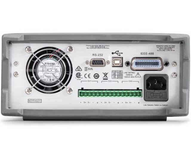 Series 2230G 電源后面板,顯示了 USB、GPIB 和 RS-232 接口和 后面輸出、來(lái)源及全部三條通道的傳感線端子塊