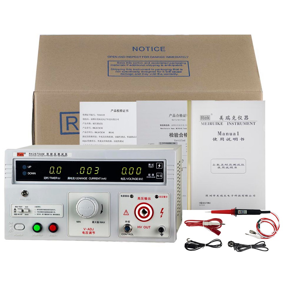 美瑞克RK2670AM型耐壓測(cè)試儀是測(cè)量耐壓強(qiáng)度的儀器,可以直觀、準(zhǔn)確、快速地測(cè)試各種被測(cè)對(duì)象的擊穿電壓、漏電流等電氣安全性能指標(biāo),并可以作為高壓源用來(lái)測(cè)試元器件和整機(jī)性能。